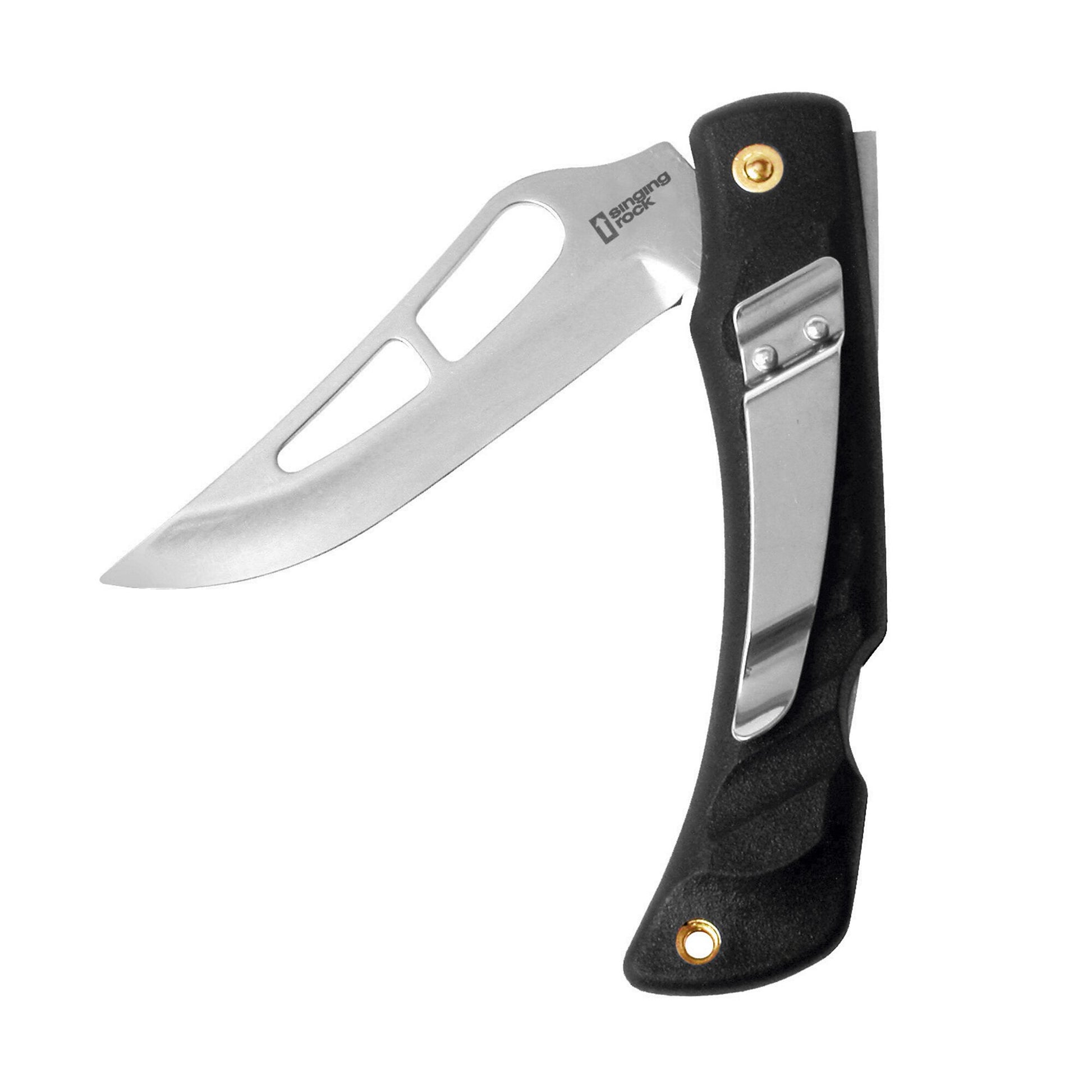 Navaja para uso turístico o de trabajo. La hoja está hecha de acero inoxidable de alta calidad. Hay orificios en la hoja que son adecuados para varios tipos de trabajo. Mango de plástico resistente con clip para cinturón. El mango tiene un orificio para enhebrar el cordón.